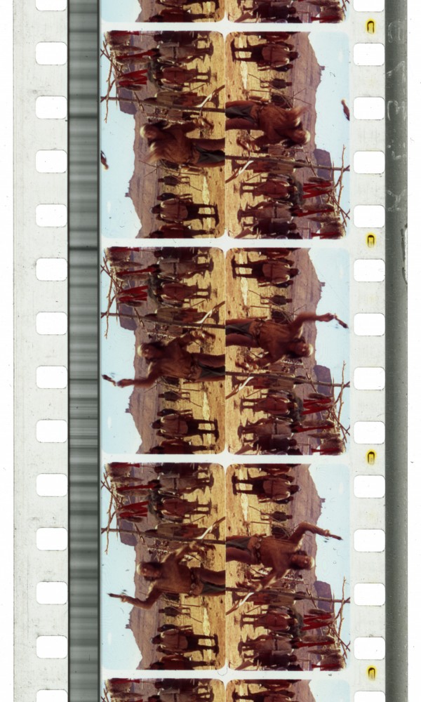 A frame from a 35mm Pola-Lite print of Douglas Sirk’s western, Taza, Son of Cochise (1954). A three-quarters shot of a man raising a spear above his head, ready to vault it forward. Seen in 3-D, the action on screen sends the spear hurtling forward towards the viewer in negative parallax. The Pola-Lite process printed both left- and right-eye images in two subframes rotated 90 degrees to each other, which then fit within the space of a traditional four-perforation, 35mm frame.
