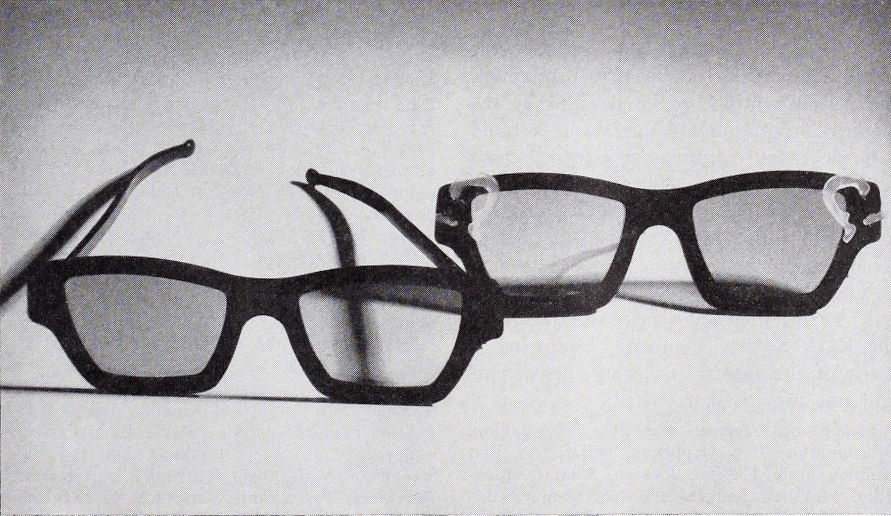 A publicity still with two models of Pola-Lite’s adjustable, plastic, polarized 3-D glasses.