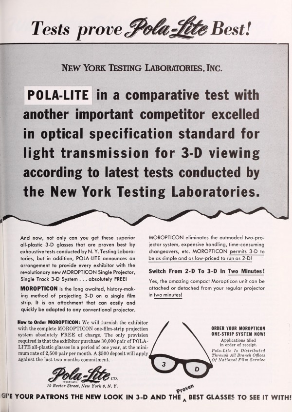 A Pola-Lite advertisement campaign, typical of those run in industry journals. While later campaigns used the Pola-Lite name for the optical system used to exhibit the one-strip 3-D process, in late 1953 Pola-Lite was still using the Moropticon branding.