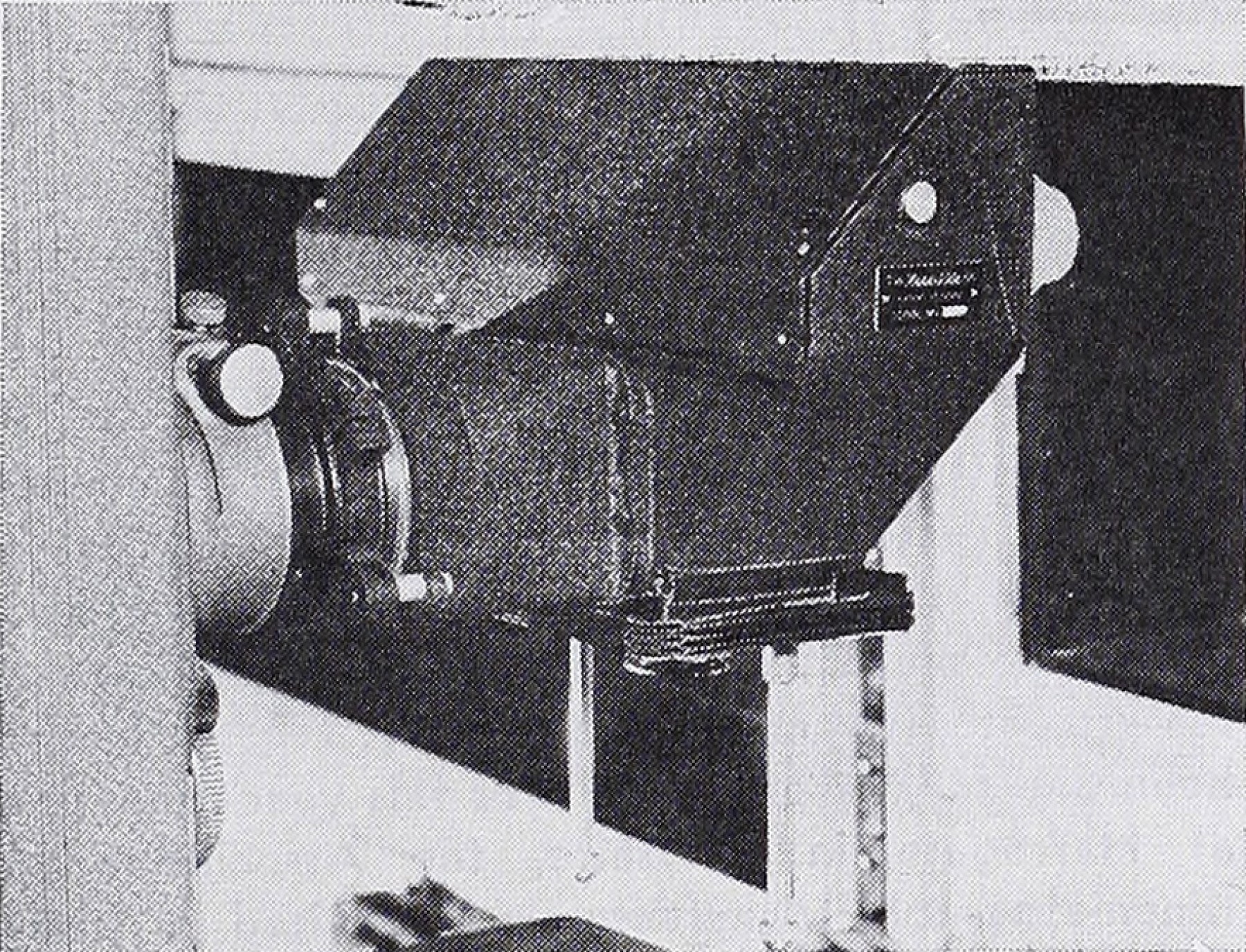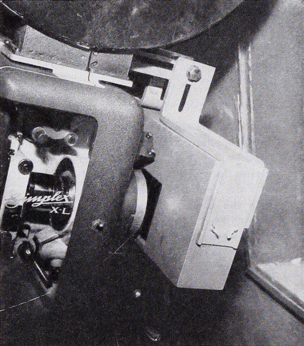 The Moropticon optical device attached to a Simplex projector using a bracket.