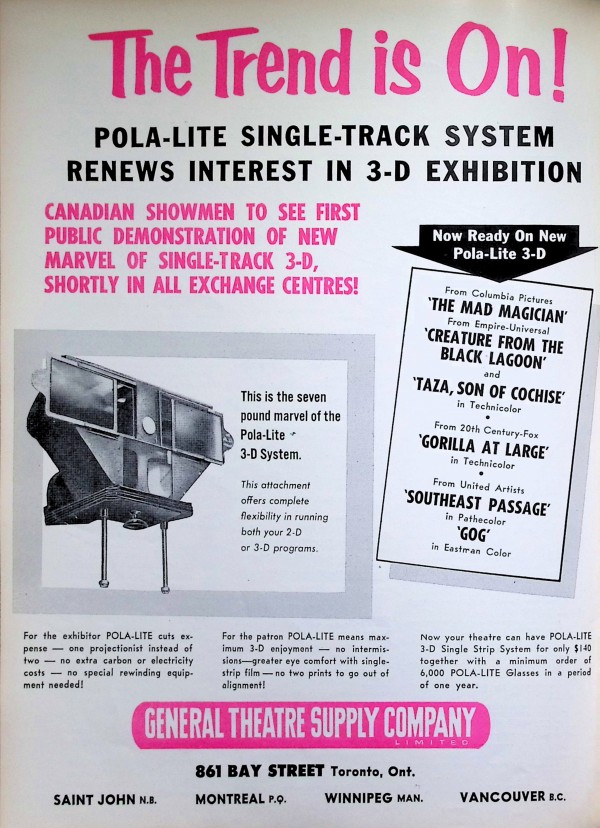 Instead, Pola-Lite publicly debuted on March 31, 1954, at the Detroit premiere of Creature from the Black Lagoon. Although Creature proved so successful in the format that Universal doubled their initial print order of the film from ten to twenty (Motion Picture Daily, 1954), and while the firm contracted with dozens of independent exhibitors and regional chains across North America to play Pola-Lite product throughout the year, the format never reached widespread use. In April, Pola-Lite vice president for distribution Al O’Keefe announced forthcoming releases in the process: Gog (1954) and Southwest Passage (1954), both from United Artists, and Gorilla at Large (1954), from Fox. But evidence for these releases remains sparse. An item in the June 30, 1954, edition of Canadian Film Weekly, following Pola-Lite’s first demonstration in that country, suggests that Pola-Lite did in fact print these films using the process. Likewise, a 3-D filmography compiled by Gary Palmer in 2004 records Pola-Lite prints for these features, as well as Jack Arnold’s 1955 Creature follow-up, Revenge of the Creature (Palmer, 2004). Research by Furmanek, and others, have yet to turn up playdates for these films in the format, or to uncover extant prints. If, indeed, prints for any of these features were made in Pola-Lite, waning public exuberance for so-called “deepies” no doubt diminished their runs – by April 1954, the industry press was readily declaring 3-D “dead” in America cinemas (Variety, 1954a).