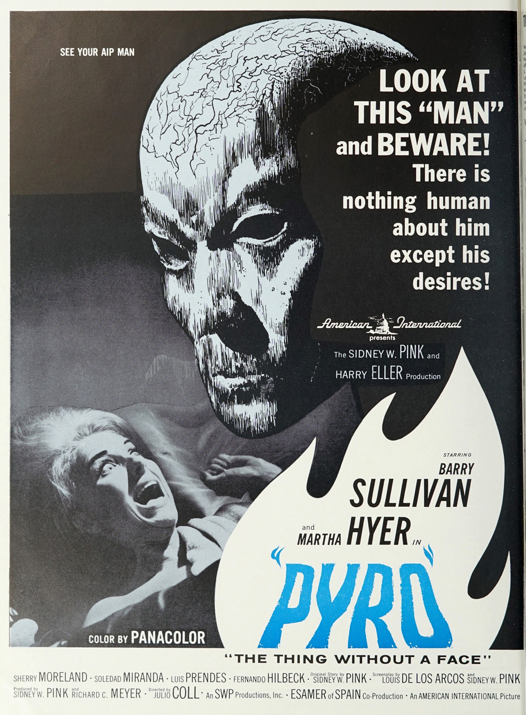 Full-page advertisement for the 1964 independent horror film Pyro… The Thing Without a Face [Fuego], announcing “Color by Panacolor”.