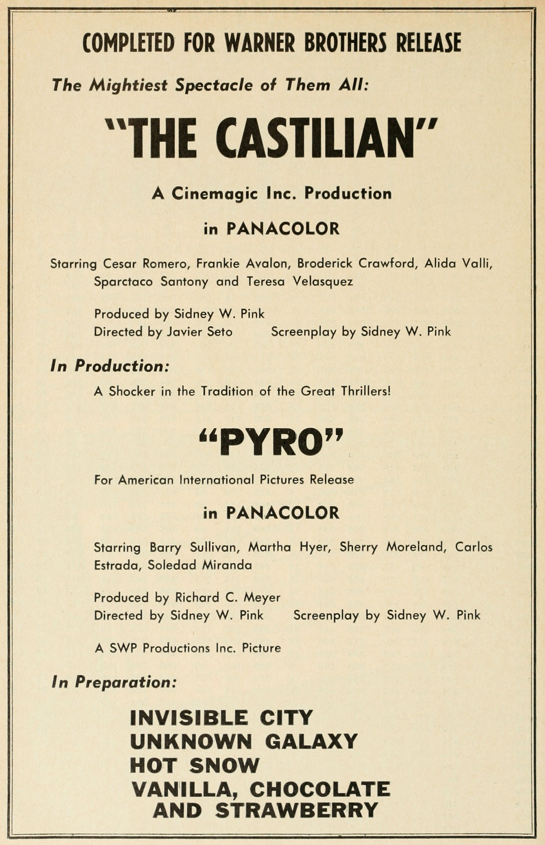 Following his work on The Castilian, Pink entered into an agreement with Panacolor, Inc. to produce four more films to be released in Panacolor. The deal gave his company, S.W.P. Productions, claim to the entirety of Panacolor, Inc.’s potential output for 1963. At the time, Panacolor, Inc. was setting up facilities to print 16mm for educational, government, and television use, though there are no records of these plans ever coming to fruition (Variety, 1963: pp. 4, 22). Pink’s first film under this deal, Pyro (1964), a horror film starring Barry Sullivan and Martha Hyer, was released in the United States and Spain to poor reviews (Monthly Film Bulletin, 1964: p. 151; Variety, 1964: p. 6). The remaining three films included in the Pink deal were never produced.