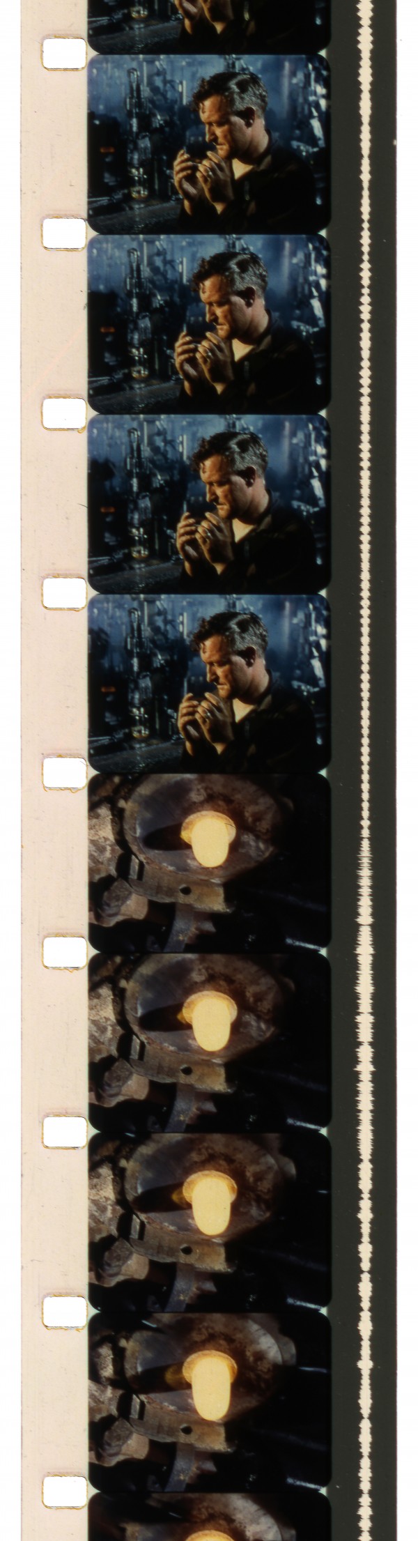 A 16mm single-rank, Technicolor dye-transfer print of Frank Capra’s Two Down and One to Go! (1945), after being slit. The print includes a blue dye-transfer track, used by Technicolor pre-1952.