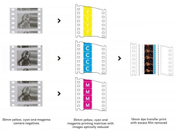 A dye-transfer process used by Technicolor to print and slit 16mm prints.